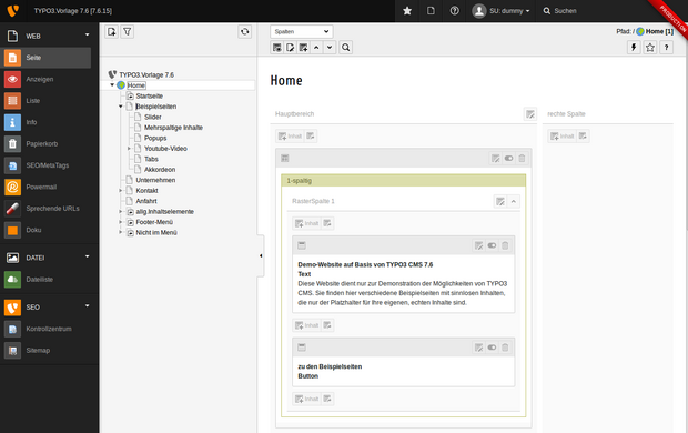 Nach dem Anmelden an TYPO3 mit Benutzername und Kennwort befinden Sie sich im sogenannten Backend, dem Arbeitsbereich. Nebenstehend sehen Sie als Beispiel den Menüpunkt Impressum.